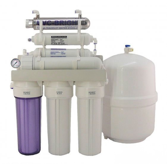 Šestistupňová jednotka se zásobníkem, mineralizátorem, UV zářičem a manometrem. Výkon 50GPD až 190 litrů za den