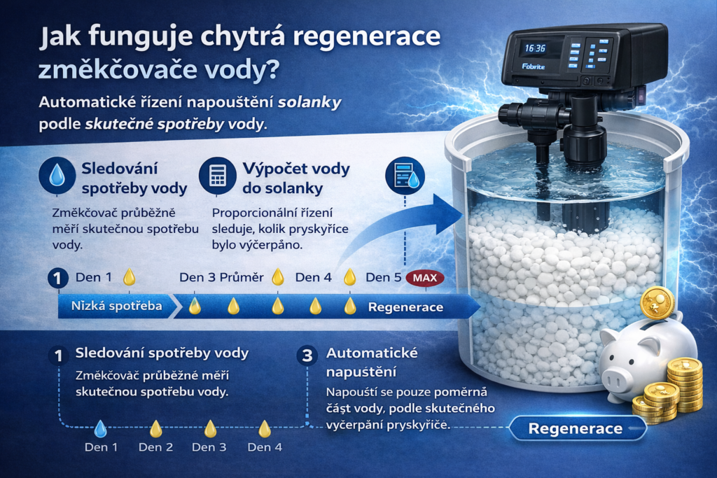 - spouští regeneraci pouze tehdy, když je to nutné a s optimálním množstvím solanky